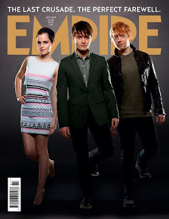 This magazine cover from Empire Magazine is advertising Harry Potter and the Deathly Hallows Part 2. This magazine cover contains a masthead and it is covered by the people in the photograph, (Harry, Ron and Hermione) which implies the audience will know what magazine it is because of the repetitive red font they instantly recognise it as Empire Magazine. The main photograph is taken in a medium long shot which shows the character's full bodies. In this magazine there is no background image which implies that the audience already know who the characters are and what film they are from. Another possible reason for not having a background image is that the magazine editor does not want to give away the setting of the film. The fact that they are holding wands show they are about to fight but the clothing they are wearing is casual which implies that they are not prepared for a battle. Also the fact they are dressed like this in this magazine cover also builds up to the hype of the actual film because in this photograph they are ready for a fight and it is building up to the battle ahead. This magazine's main focus is all about Harry Potter and the Deathly Hallows Part 2. There is alot of incentives and anchorage text on this cover which try to lure the audience in to buying their magazine. An example of this is the strap-line at the top and bottom of the magazine cover with lexis saying, "FREE SPECTACULAR POTTER PHOTO SPECIAL" This is one of the incentives used on this magazine front cover to lure the audience in. Another lure used is the gold banner in the centre of the page just below the main headline of the magazine giving away the main focus of the magazine. This banner includes desirable elements that the audience will want if they buy this magazine. These are things like the "Free 36 page photo special", "Free collectors' portfolio", "Limited edition cover" and "The complete cast come together for our biggest ever exclusive". These techniques have been used perfectly as a lure for the audience as they are the second most recognisable element aside from the photograph featuring Harry Potter, Ronald Weasley and Hermione Granger.